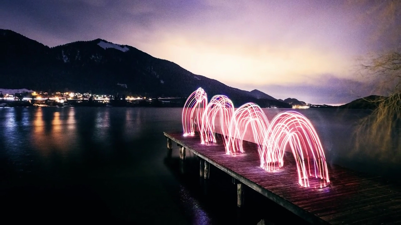 A ideia é simples: colar luzes de Natal, ou outros tipos de luzes led, em um bambolê. O interessante é fotografar durante a noite. Com longa exposição e movimentos do bambolê, é possível criar formas interessantes na imagem.