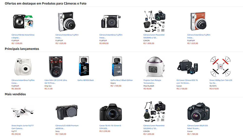 A seção Câmeras e Foto é visível logo na página inicial da loja, entre as demais seções de eletrônicos. Estão disponíveis desde câmeras digitais dos mais variados formatos (compactas, DSLR, mirrorless, instantâneas) até acessórios como flashes, tripés, cartões de memória, bolsas e até drones para fotografia e filmagem. Além das promoções de lançamento, é possível parcelar o pagamento em até 10 vezes sem juros. Mais uma opção para o consumidor brasileiro – e maior concorrência no mercado de equipamentos fotográficos, o que é sempre saudável de se ter.