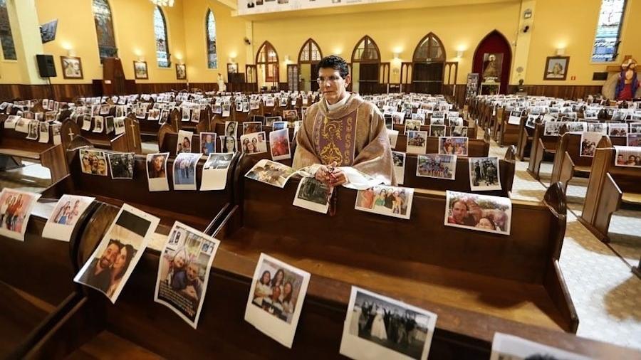 Padres celebram missas com fotos de fiéis coladas nos bancos das igrejas