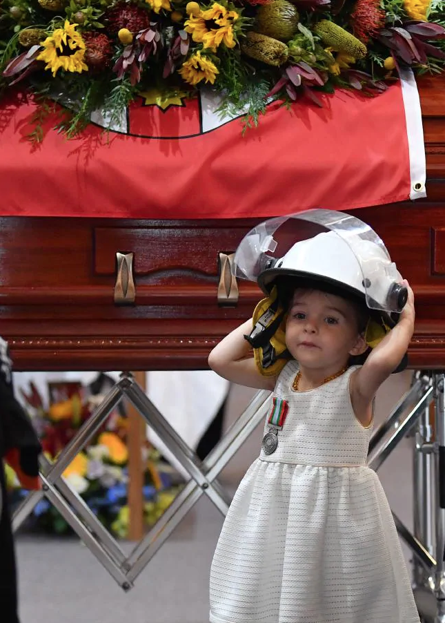 Foto de filha de bombeiro que morreu na Austrália comove ao usar capacete do pai