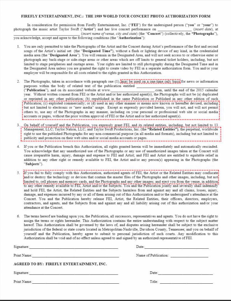 O contrato não retira, de forma alguma, o direito autoral do fotógrafo, mas, basicamente, permite à empresa de Taylor Swift, Firefly Entertainment, Inc, utilizar as fotos da forma que quiser, enquanto os fotógrafos podem apenas possuí-las, não sendo liberada a utilização de forma alguma.