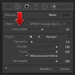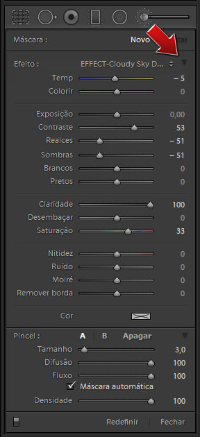 Pois então, sabia que existe um recurso semi-oculto no Lightroom que permite acertar a intensidade de um ajuste localizado, mesmo que ele seja uma combinação de vários deslizantes? Para fazer isto, basta clicar nesta Seta, ao lado do menu efeito, na parte superior direita do painel do Pincel de Ajuste Localizado.