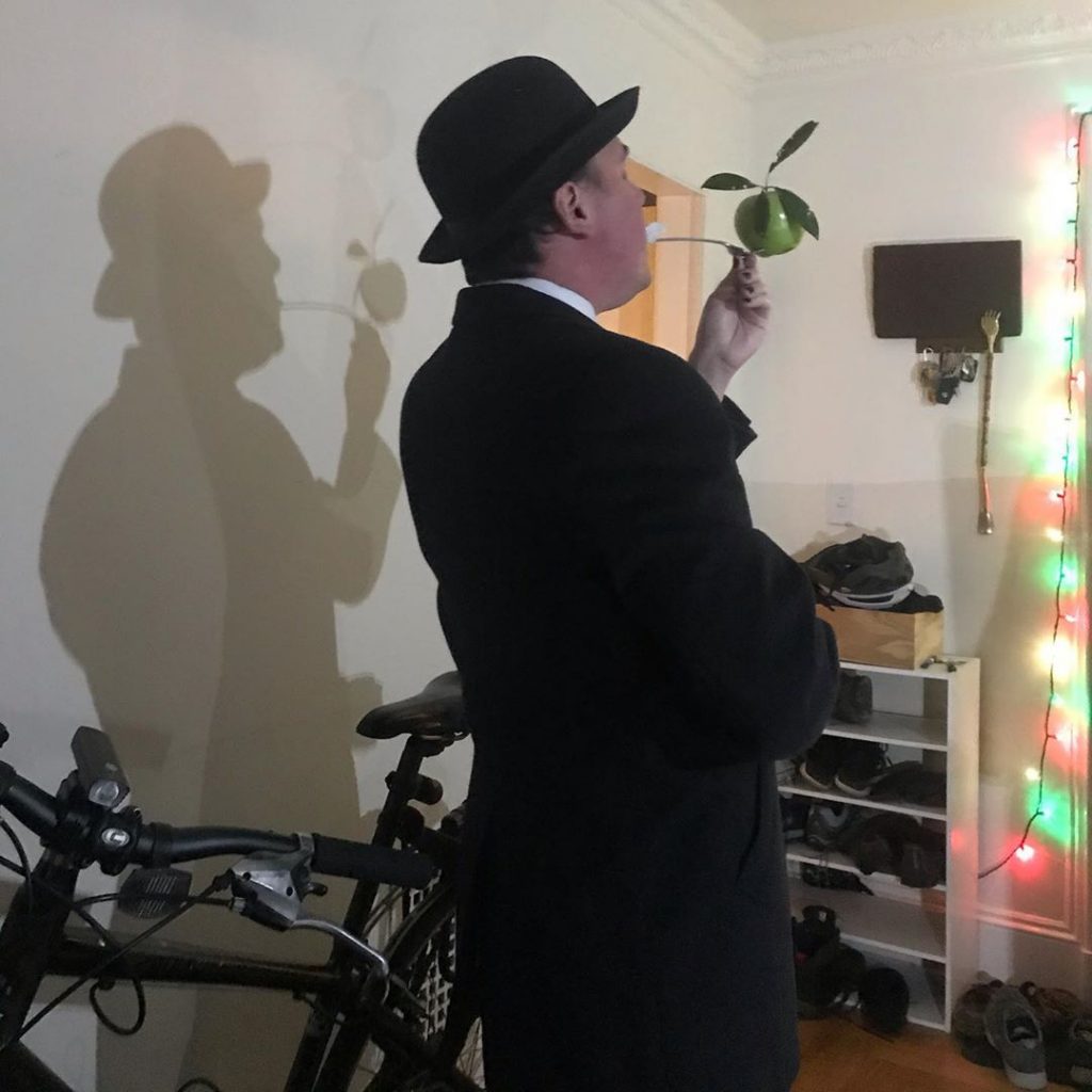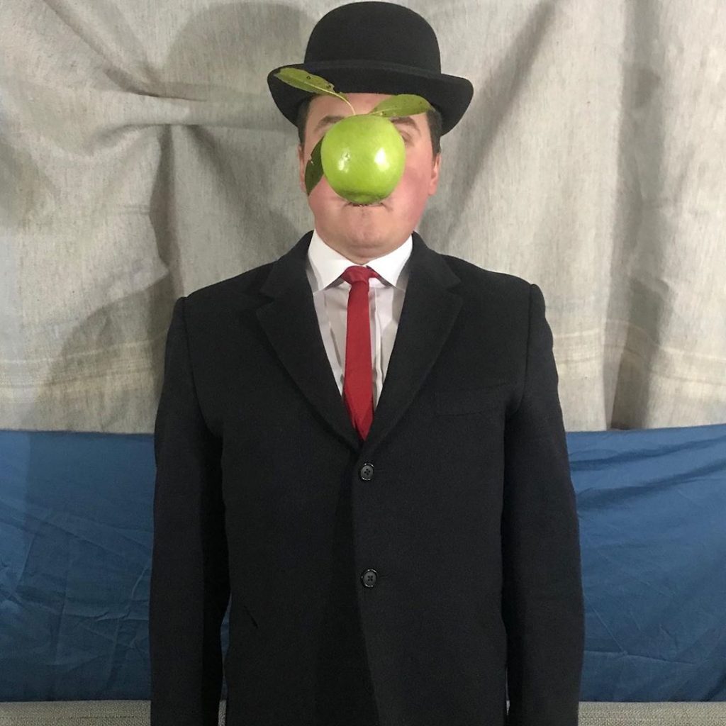 Recriação da pintura “The Son of Man”, de René Magritte. Abaixo original e bastidores.