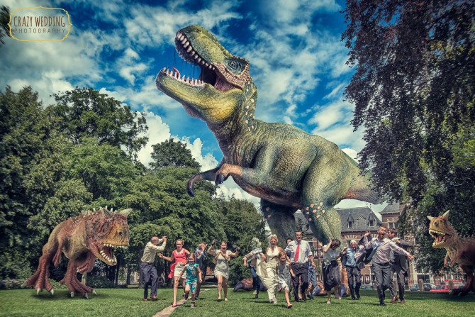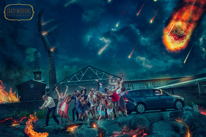 A fotografia de casamento, via de regra, geralmente é aquele registro de um belo e memorável dia para duas pessoas. Mas e que tal, no meio de toda essa felicidade e ternura, surgir um dinossauro? Ou meteoros começarem a cair do céu transformando o momento em um verdadeiro apocalipse?