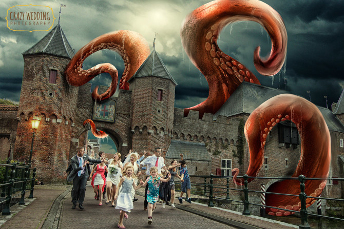 Fotografia de Casamento traz dinossauros, meteoros e polvo gigante para a festa