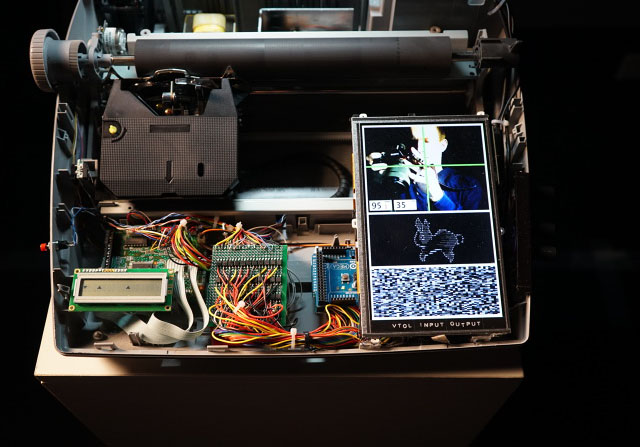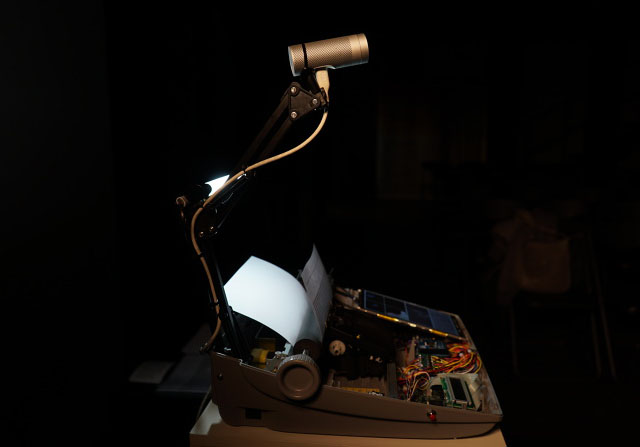 O sistema, apelidado de “i/o,” consiste na máquina de escrever, uma plataforma Arduino para controlar as operações, uma câmera iSight da Apple e uma lâmpada para iluminação.